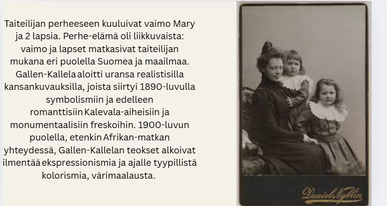 Taiteilijan perheeseen kuuluivat vaimo Mary ja kaksi lasta. Perhe-elämä oli liikkuvaista; vaimo ja lapset matkustivat taiteilijan mukana eri puolilla Suomea ja maailmaa. Gallen-Kallela aloitti uransa realistisilla kansankuvauksilla. 1890-luvulla hän siirtyi symbolismiin ja edelleen romanttisiin Kalevala-aiheisiin sekä monumentaalisiin freskoihin. 1900-luvun puolella, erityisesti Afrikan-matkan yhteydessä, Gallen-Kallelan teokset alkoivat ilmentää ekspressionismia ja ajalle tyypillistä kolorismia.