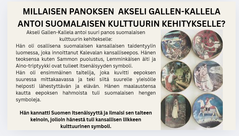 Tänään haluan kertoa teille suomalaisesta taiteilijasta Akseli Gallen-Kallelasta. Hän eli vuosina 1865 (tuhatta kahdeksansataa kuusikymmentä viisi)–1931 (tuhatta ja yhdeksansataa kolmekymmentä yksi)tunnetaan erityisesti Kalevalan aiheita kuvaavista teoksista. Hän halusi esittää suomalaisuutta ja maalasi myös tavallisia ihmisiä, kuten talonpoikia ja torppareita.