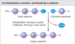 Dehydration Reaction - A reaction in which two molecules are covalently bonded to each other with the loss of a water molecule. The picture above illustrates how the Dehydration reaction happens when connecting monomers.