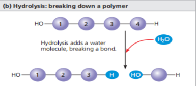 Hydrolysis : Opposite of Dehydration ; addition of water molecule to break a bond in the polymer.