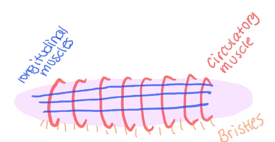 circular muscles : squeeze the front end forward and the back end backward. little bristles on the bottom, they anchor the belly into the soil so the worm doesnât slide backwards. (make them longer) (roundworms do not have circular muscles)
