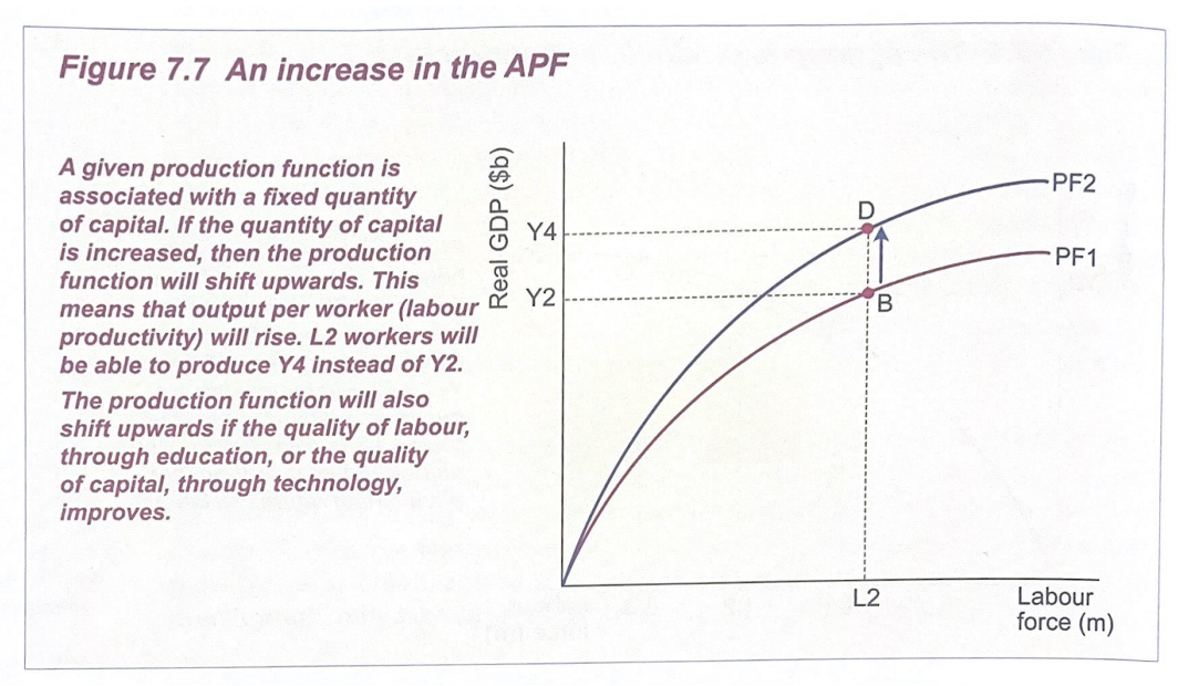 increase quality of capital and/or labour= movement upwards of the curve