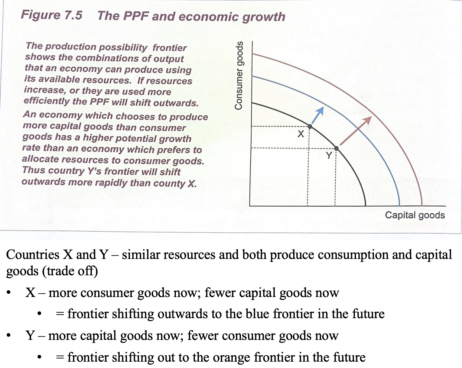 The PPF model also can illustrate how a trade off between present and future consumption might influence the potential rate of growth.