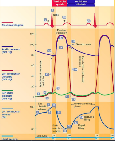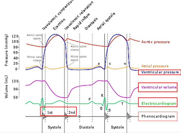 As ventricular pressure falls below aortic pressure, the aortic and pulmonary valves close, producing the second heart sound (S2).