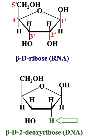 Deoxyribose in DNA (missing hydroxyl at carbon 2 (replaced by -H)).