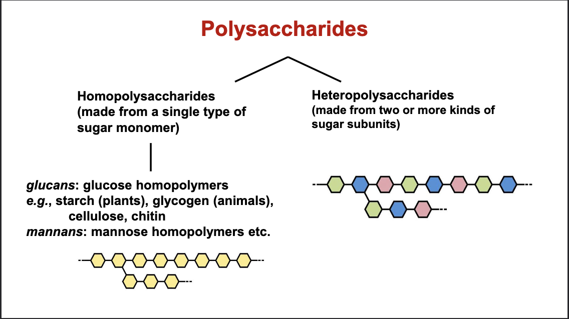 Differentiation based on types of sugars involved and glycosidic bond types. (sugar units that are linked, in the length of the chains, in the type of bonds linking the units, and in the degree of branching)