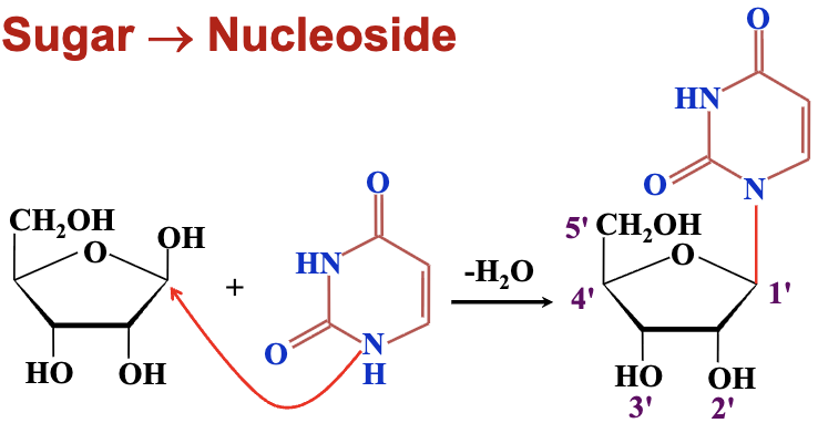 Nucleoside Formation: Base + Sugar → Nucleoside