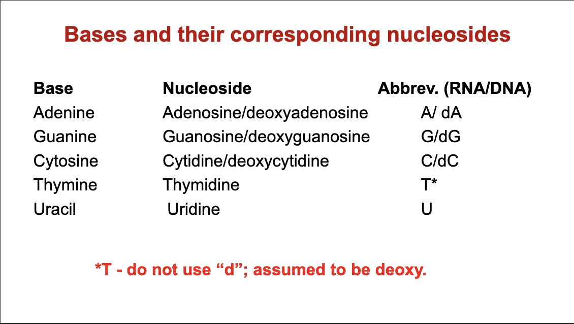 Adenosine (A), Cytidine (C), Guanosine (G), and Thymidine (T) for DNA (do not indicate deoxy).