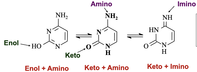 Bases can exist in tautomeric forms (i.e., shift in hydrogen position affecting double bonds).
