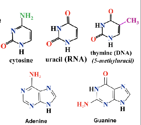 Classified as purines (Adenine, Guanine) or pyrimidines (Cytosine, Uracil in RNA, Thymine in DNA).