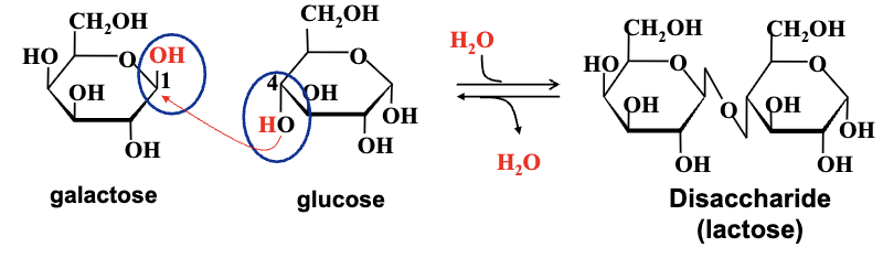 The glycosidic bond of lactose is formed by the anomeric carbon of galactose in the β configuration reacting with the hydroxyl of carbon 4 of glucose