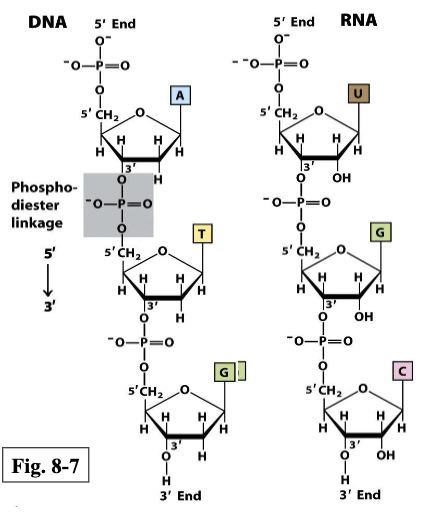 Each linear nucleic acid strand has a defined 5′5′ end (lacking a nucleotide at the 5′5′ position) and a 3′3′ end (lacking a nucleotide at the 3′3′ position).