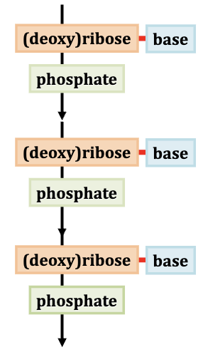 A phosphate group connects the 5′5′ hydroxyl (OH) of one nucleotide unit to the 3′3′ hydroxyl (OH) of an adjacent nucleotide.
