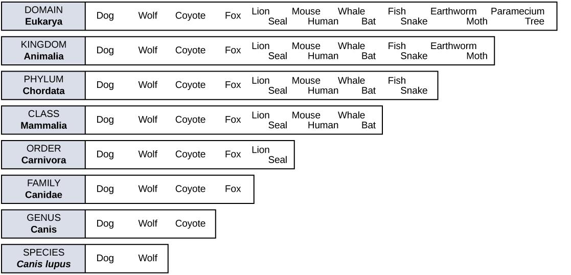 In the 18th century, a scientist named Carl Linnaeus first proposed organizing the known species of organisms into a hierarchical taxonomy. In this system, species that are most similar to each other are put together within a grouping known as a genus. Furthermore, similar genera (the plural of genus) are put together within a family. This grouping continues until all organisms are collected together into groups at the highest level. The current taxonomic system now has eight levels in its hierarchy, from lowest to highest, they are: species, genus, family, order, class, phylum, kingdom, domain. Thus species are grouped within genera, genera are grouped within families, families are grouped within orders, and so on (Figure 1.9).