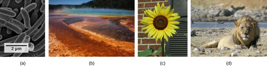Figure 1.10 These images represent different domains. The scanning electron micrograph shows (a) bacterial cells belong to the domain Bacteria, while the (b) extremophiles, seen all together as colored mats in this hot spring, belong to domain Archaea. Both the (c) sunflower and (d) lion are part of domain Eukarya. (credit a: modification of work by Rocky Mountain Laboratories, NIAID, NIH; credit b: modification of work by Steve Jurvetson; credit c: modification of work by Michael Arrighi; credit d: modification of work by Frank Vassen)