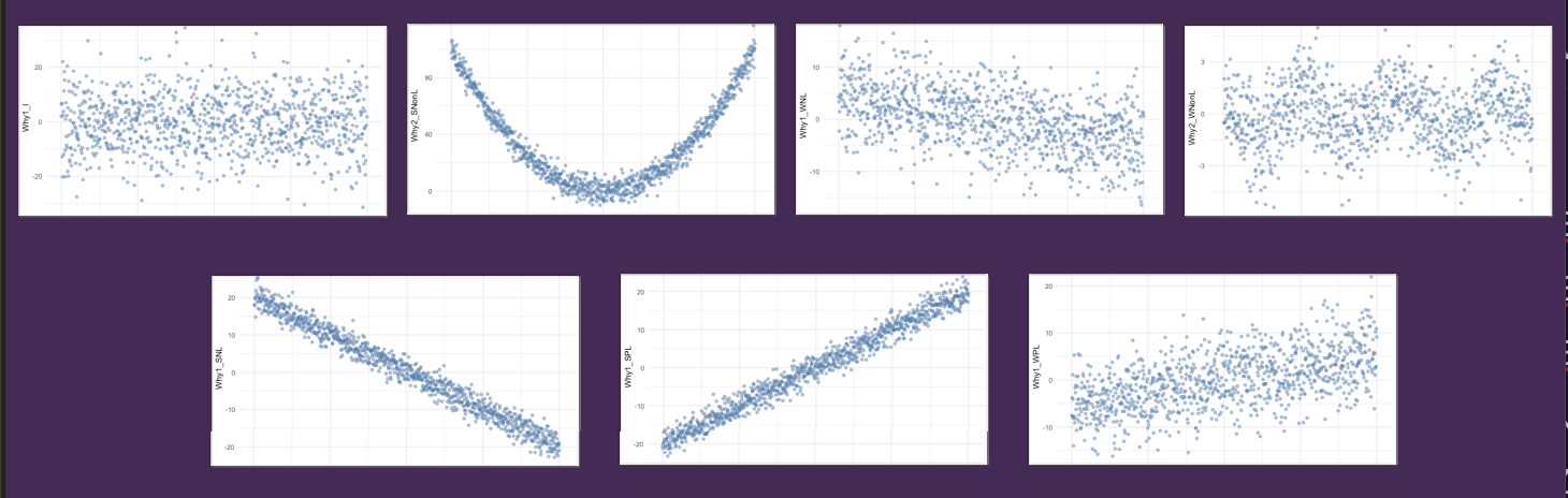 We can investigate the relationship between variables by plotting them on a x/y plot where the RESPONSE variable is on the Y axis and the EXPLANATORY variable(s) is/are on the X axis