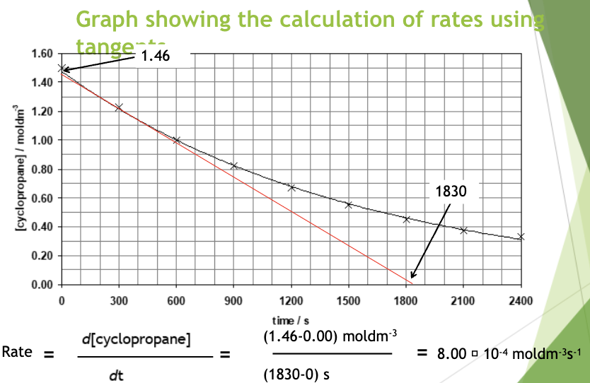 By drawing a tangent to the curve at various points we can calculate the rate of reaction at that specific point