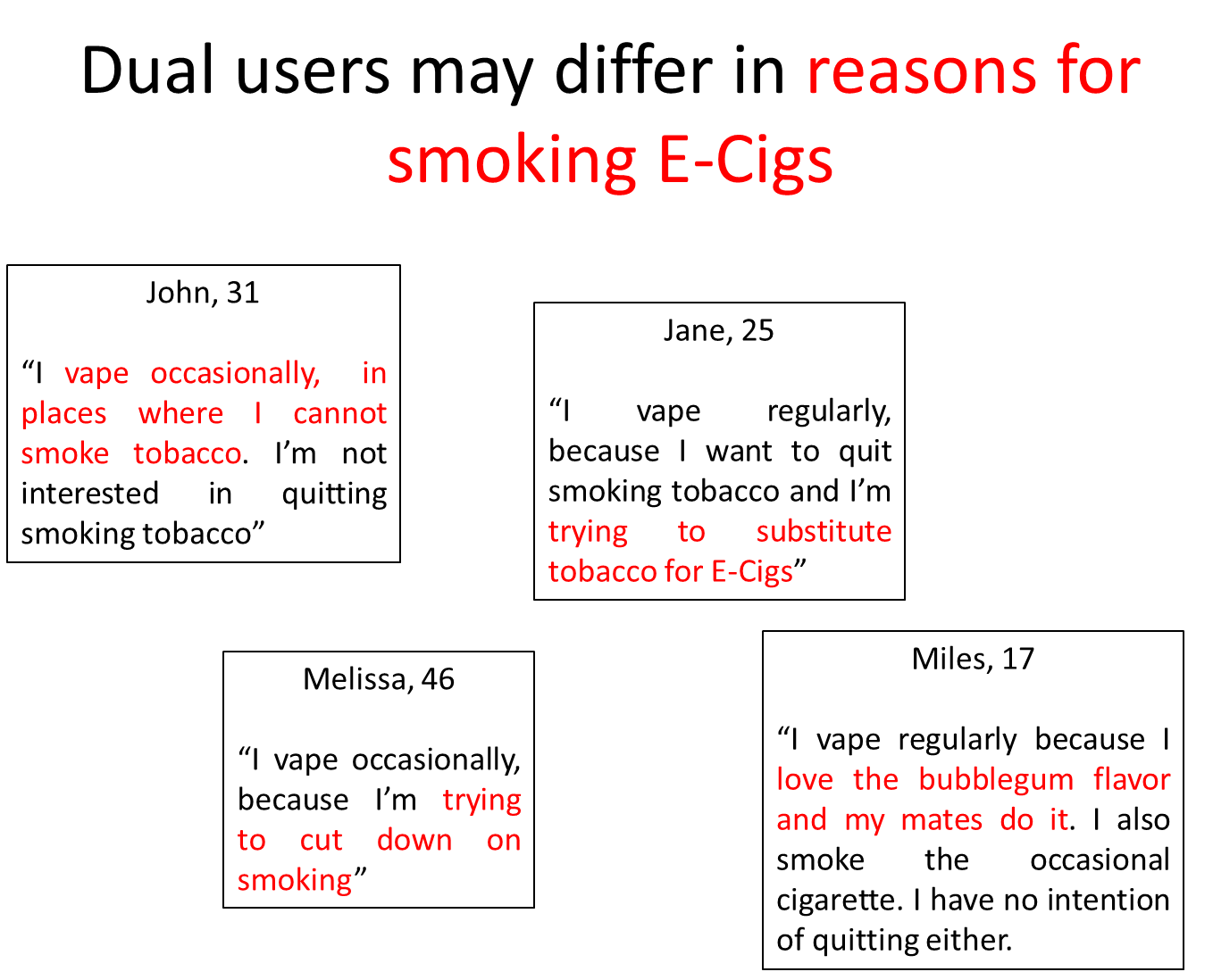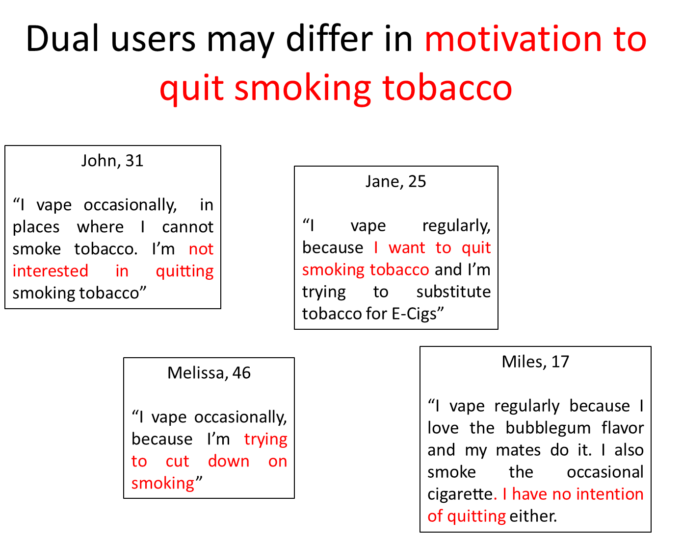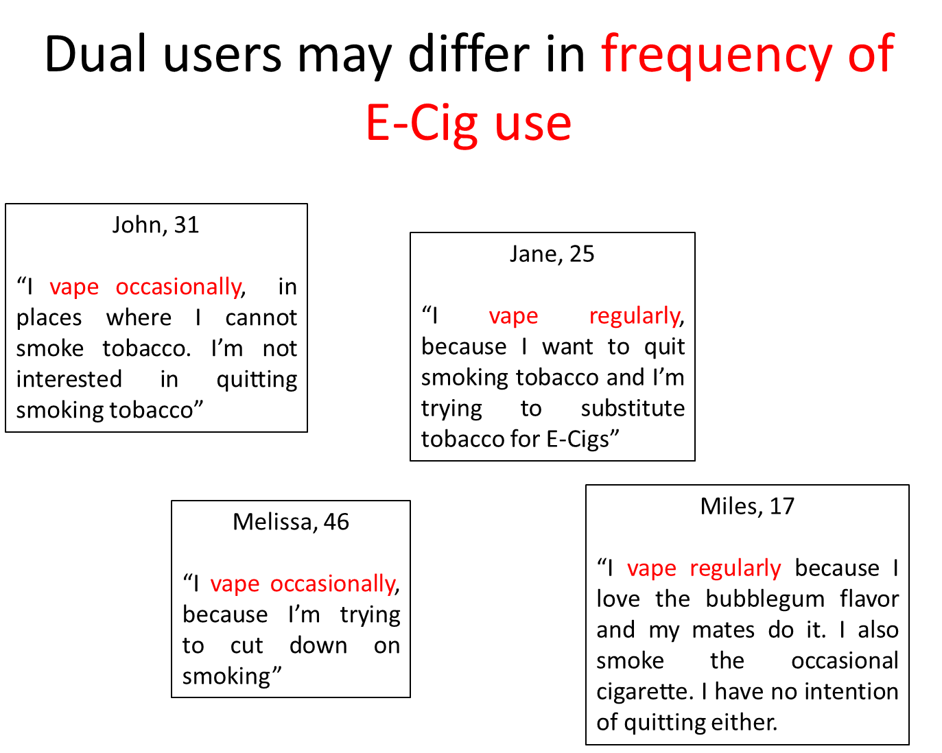these groups may differ in the extent they want to quit, why they are using e-cigs and the frequency of use