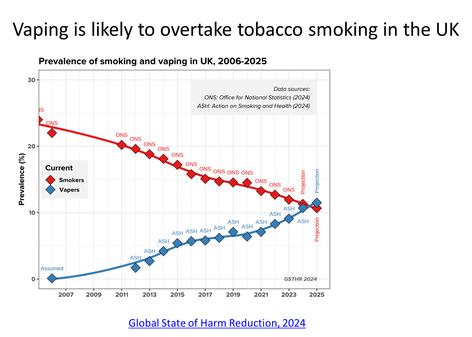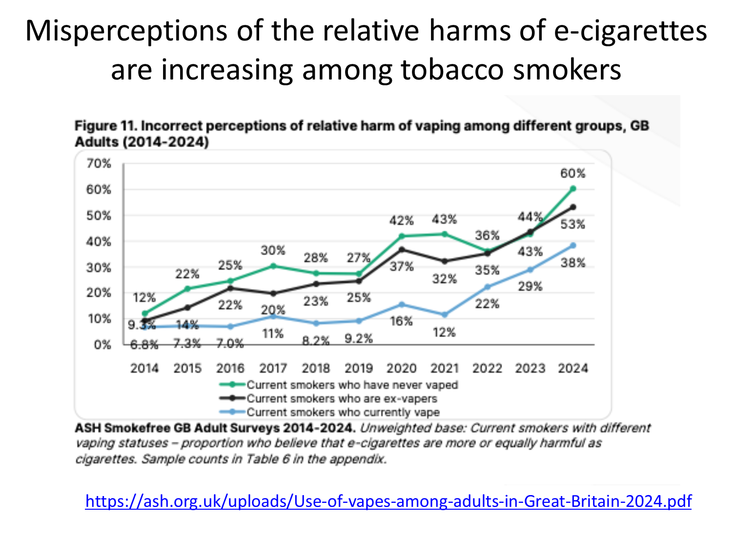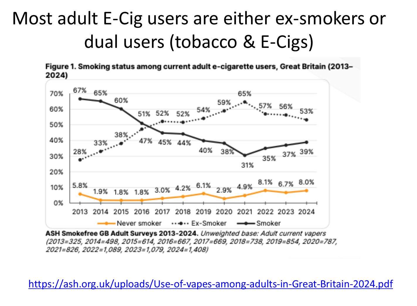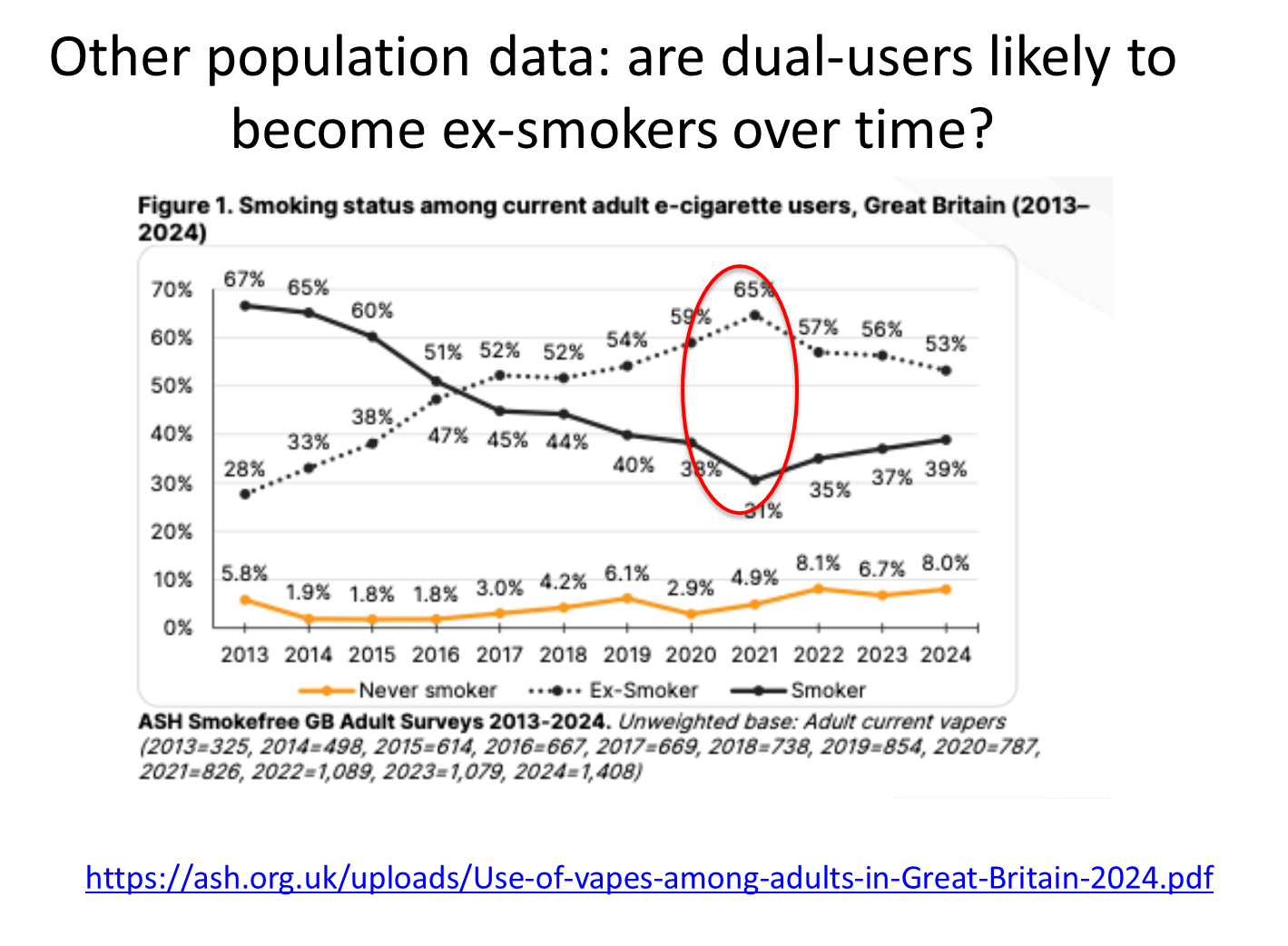 but at some point this cross over occurs, so in 2024 53% used to smoke tobacco but quit