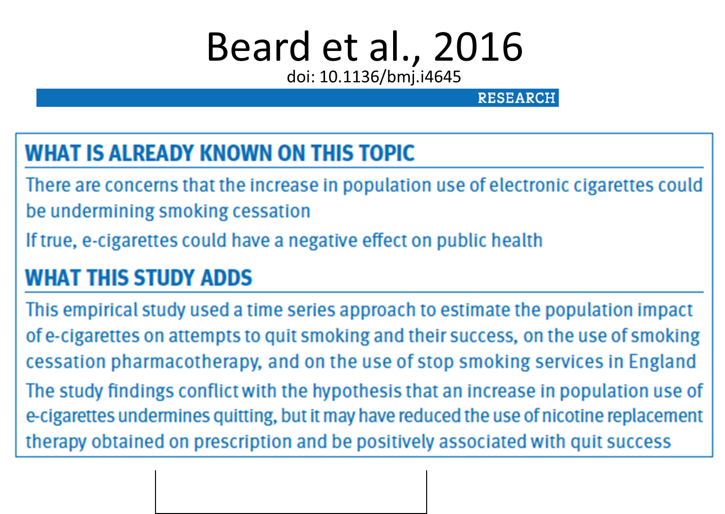 across a ten year time periods, for every 1% increase in the pop prevalence of E-Cig use among tobacco smokers, the success rate of attempts to quit tobacco smoking increased by 0.1%