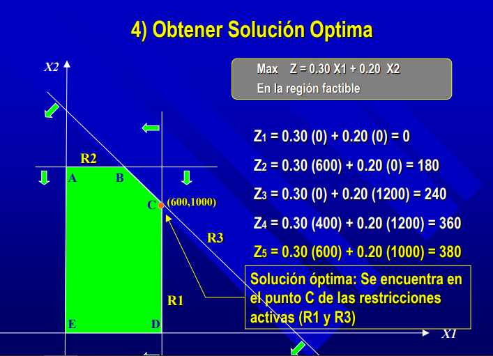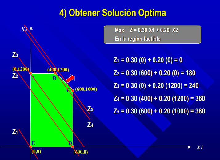 Se debe dibujar el contorno de la función objetivo (línea iso-beneficio) mediante rectas paralelas, en cada vértice, según la relación: