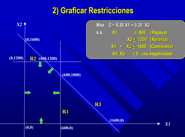 Cantidad máxima de Papaya < 600 kilos. x1 < 600Cantidad máxima de Naranja < 1200 kilos. x2 < 1200