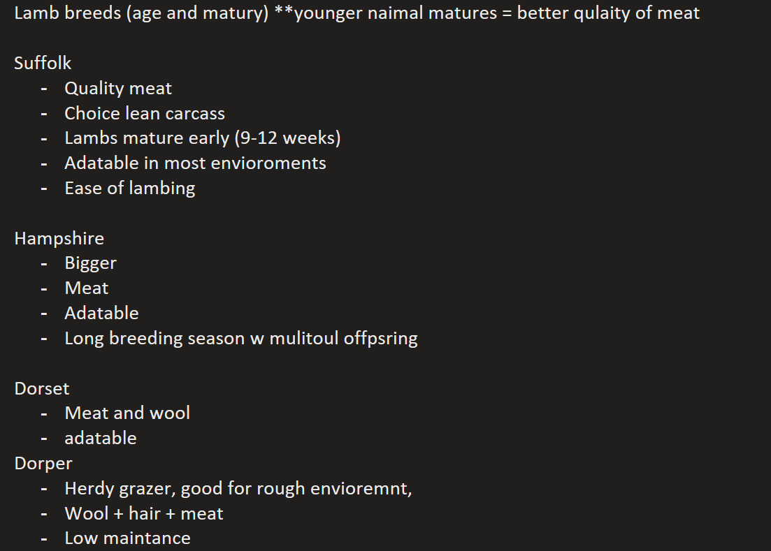 Lamb breeds (age and matury) **younger naimal matures = better qulaity of meat