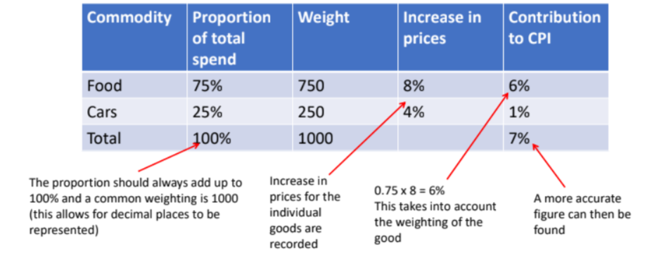 Changes in the price of food is more important than changes in the price of things such as tobacco. Therefore the figures are weighted before the final index can be calculated.