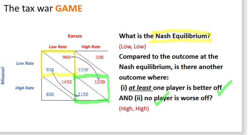 The tax war between Kansas and Missouri harmed government finance and its ability to provide public services.Pareto efficient outcomes are not necessarily fair.