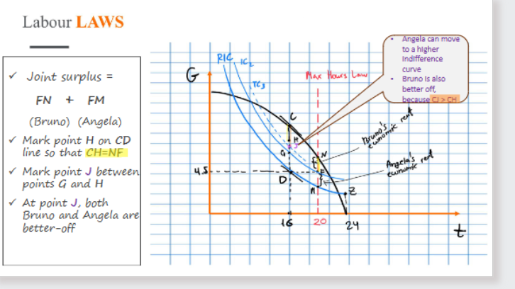 Joint Surplus: Total amount of grain produced minus what Angela should get to work certain t hours.