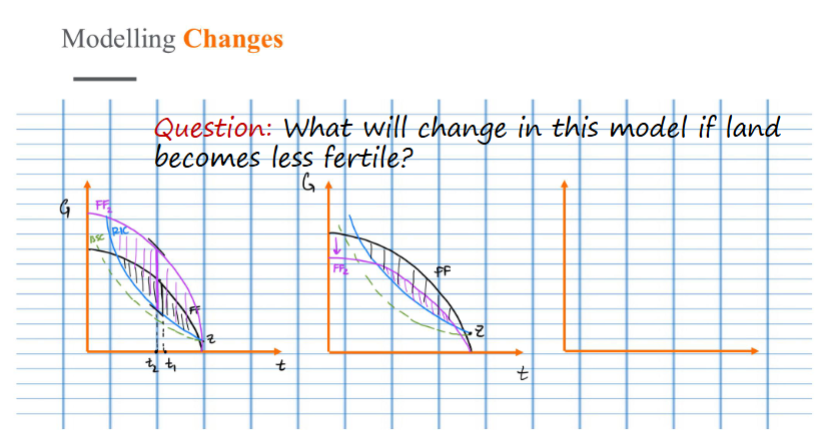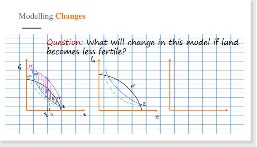 If land becomes less fertile, her feasible set shrinks (FF1 to FF2). this is a biological constraint