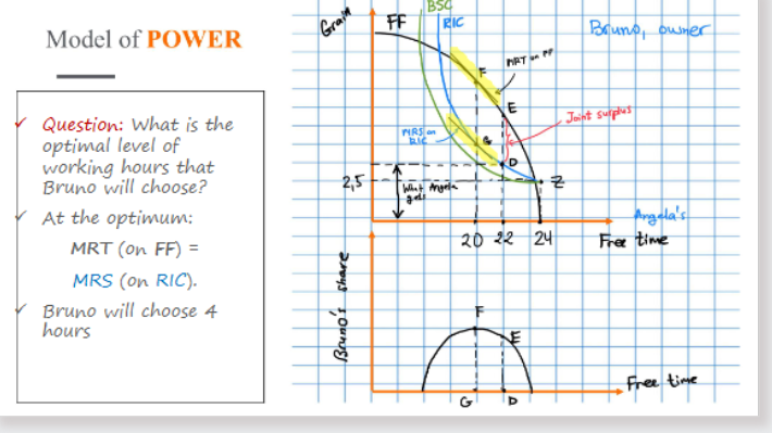 The optimal level of working hours Bruno will choose is 4: MRT (on FF) = MRS (on RIC)