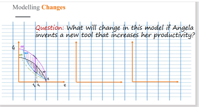 if Angela’s productivity increases, then her Feasible set expands, as she can produce more grain in a given time (FF1 to FF2)