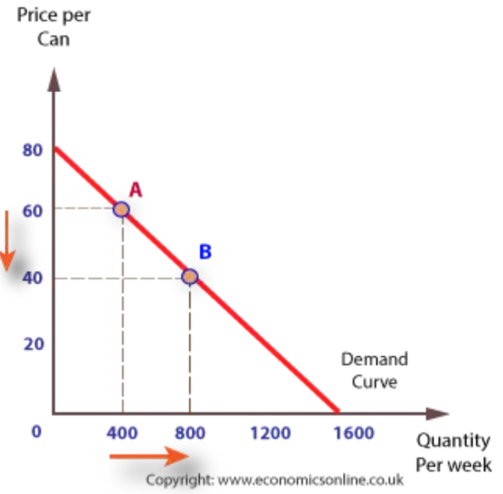 In the graph shown above, we can see that from point A to B, the quantity demanded per week of the considered good has gone up from 400 to 800 units as the price of the good went down from P60 to P80. We can also say that from point B to A, the quantity demanded of the considered good has gone down from 800 to 400 as the price went up from P40 to P60