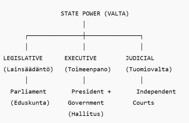 Hallitus = toimeenpano → pääministeri johtaa, eduskunta valvoo. (Government = executive → PM leads, Parliament supervises)