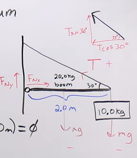 For example, (T sin(30°) x 2 m )- (weight of the boom 20kg x gravity x distance to center 2 m ) to find T.