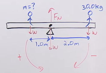 Left side( mass unknown x gravity x 1 m) = Right side (30 kg x gravity x 2 m)