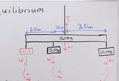Positive torque from the unknown mass (left side) and negative torque from the known mass (30 kg on right side).