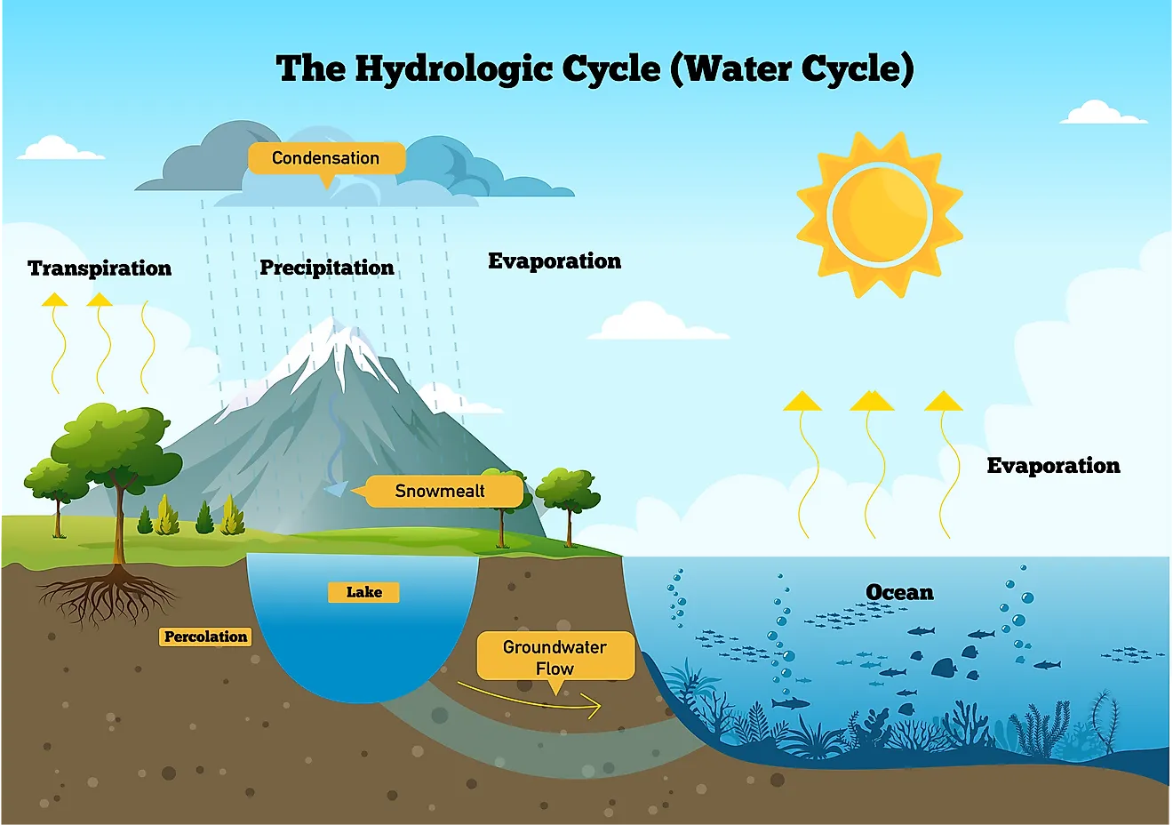 Energy Source: The sun is the primary energy source that drives the water cycle through evaporation and heating.