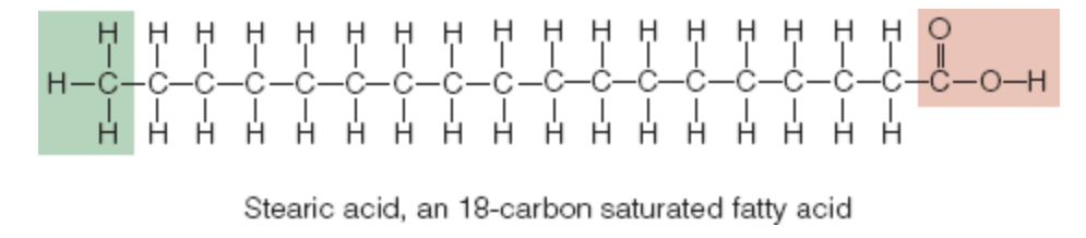 stearic acid: simplest of the 18 carbon fatty acids, bonds between its carbons are all alike, saturated fatty acid