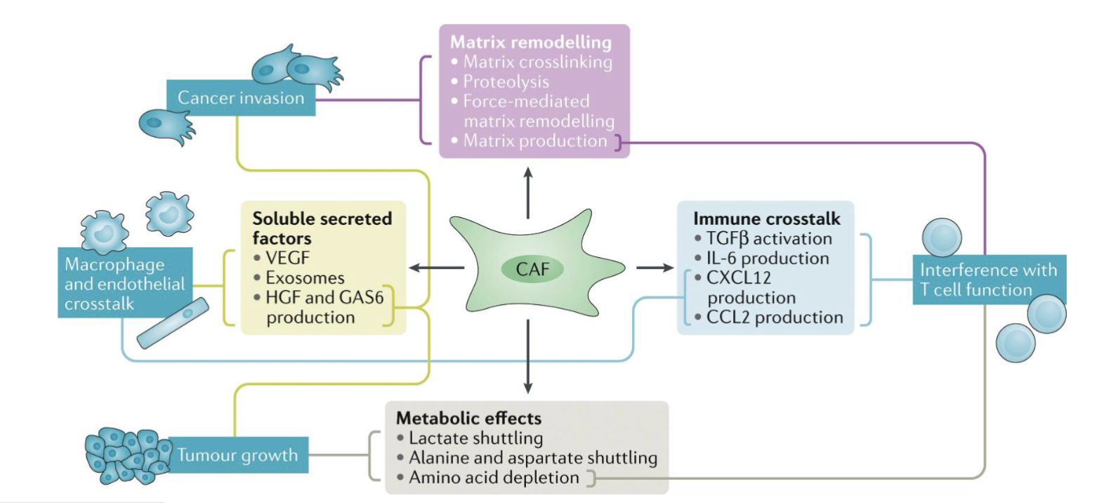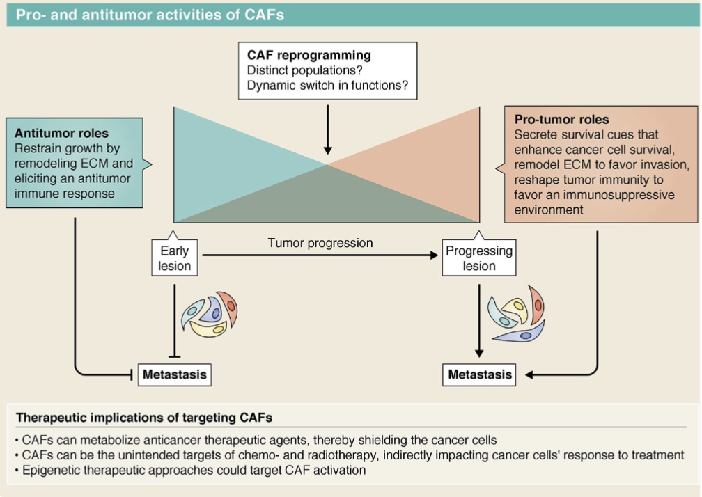 At early stages of disease CAFs can activate the immune system and suppress cancer, though mostly afterwards they take on a pro-tumour role