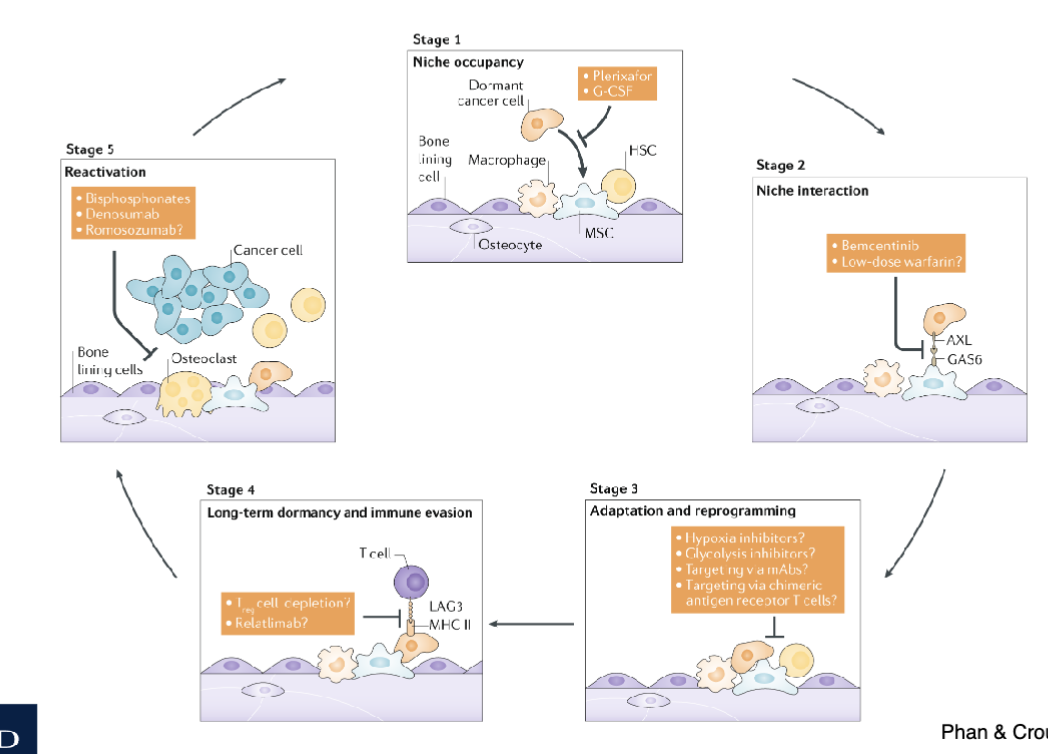PCa cells compete with HSCs for endosteal HSC niche, increasing niche size promotes metastasis and HSC mobilisation protocols mobilise PCa cells ffrom niche to circulation (??) to target via chemo