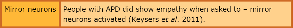 Mirror neurons - Recent research suggests that criminals with APD can experience empathy but they do so more sporadically than the rest of us. Christian Keysers et al found that only when criminals were asked to empathise (with a person depicted on film experiencing pain) did their empathy reaction (controlled by mirror neurons in the brain) activate. This suggests that APD individuals are not totally without empathy, but may have a neural switch that can eb turned on and off, unlike the normal brain which has the empathy switch permanently on.