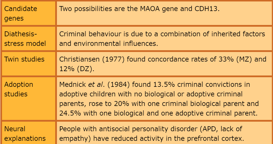 Low concordance rates in genetic studies suggest that genes play a minimal part in the development of that particular characteristic, e.g. criminal behaviour. If genes were solely responsible then the concordance rate for criminal behaviour for MZ twins should be 100% as they share 100% of genes. Low concordance rates suggest environmental factors may be responsible or at least partly responsible for criminal behaviour. The diathesis-stress model could be used to explain criminal behaviour where concordance rates for MZ twins are not 100%; genes create a vulnerability or predisposition towards criminal behaviour combined with stressors and experiences in the environment acting as a trigger for criminal behaviour.
