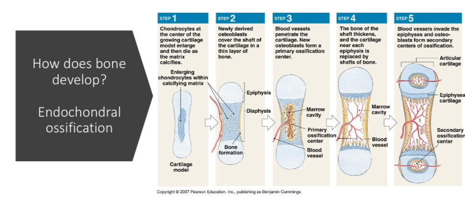 In foetal development, 2 mechanisms which create bone tissue - endochondral ossification and intramembraneous ossification.