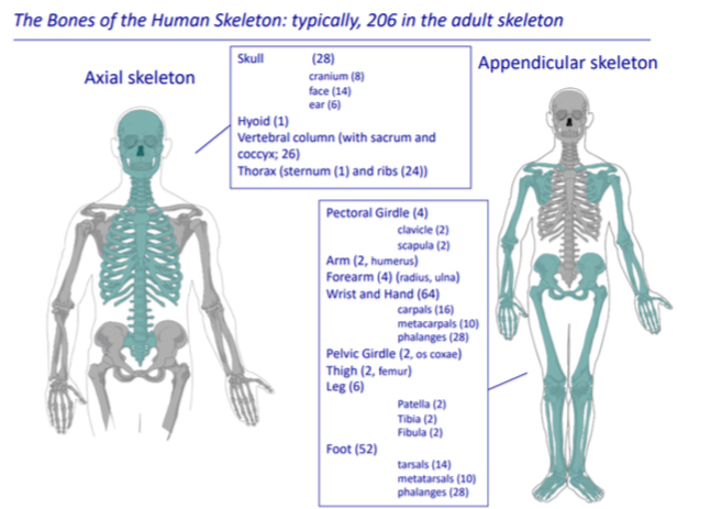 The skeleton is the frame to support the body weight, it protects the organs, gives lever for movement, attachment for muscles (landmarks and features), storage for calcium and phosphorous and haematopiesis (RBC, WBC, platelets in bone marrow).