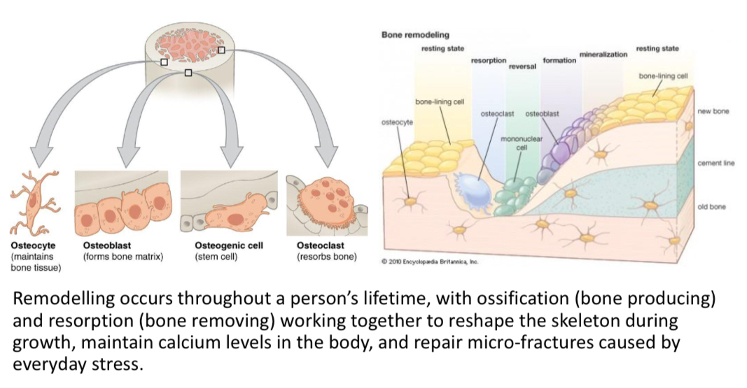 Remodelling is a life long process which consists of breaking down old bone (resorption) and the formation of new bone (ossification). It is key for shaping the skeleton, repairing fractured bones, and maintaining calcium levels.