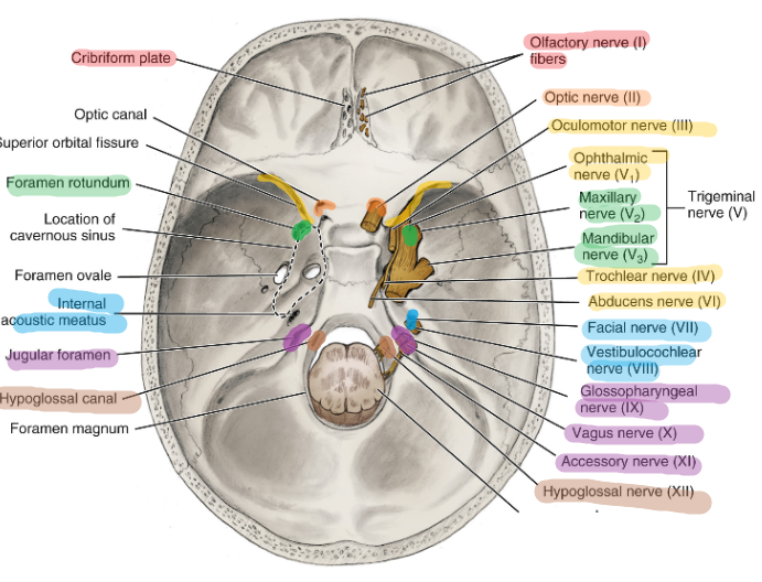 Mandibular (V3) | Afferent & Efferent | Sensory: pain, temperature, touch, and pressure (lower face, including mandibular teeth) Motor: mastication ![]() | foramen ovale ![]() |