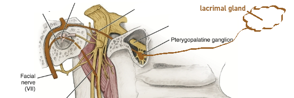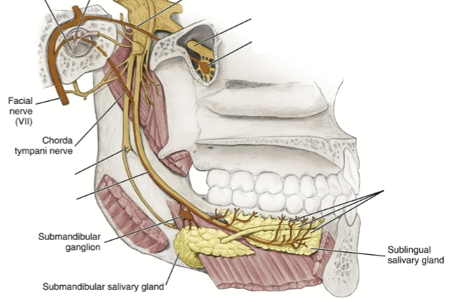 Pathway (2): | Lacrimal Gland: facial nerve → pterygopalatine ganglion → lacrimal gland ![]() Salivary Glands: facial nerves → chorda tympani (branch) → submandibular ganglion, submandibular and sublingual salivary glands ![]() |