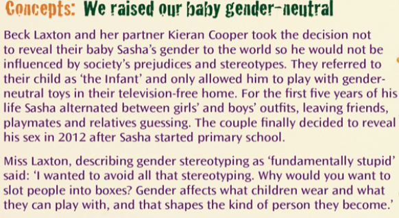 - these can also be used to support social learning theory of gender that various agents of socialisation like parents or media, support and sustain the stereotypical expectations we have of men and women in our society.